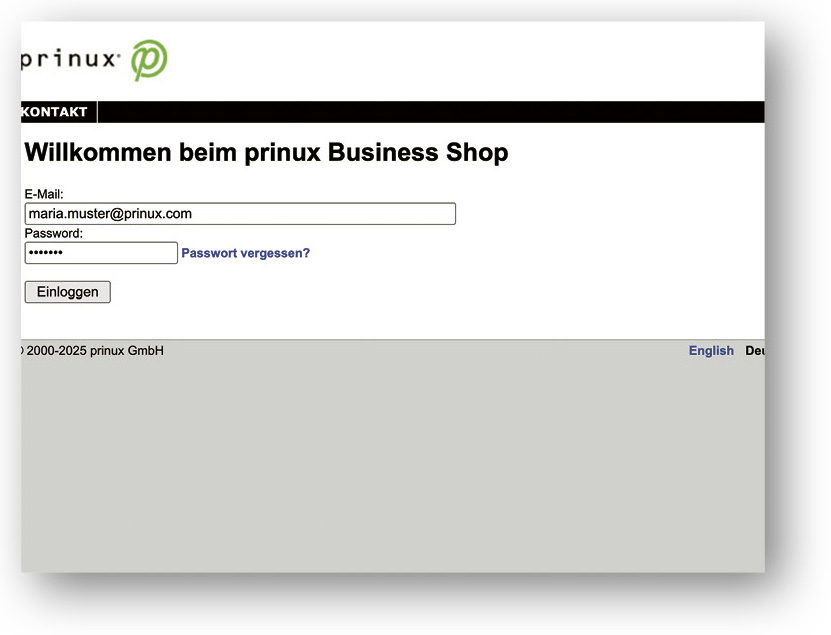 Der simpelste Weg zu prinux-Produkten ist der klassische prinux Business-Shop. Er wird vom prinux-Team für Ihr Unternehmen eingerichtet, inklusive der Useraccounts, die dafür bestellberechtigt sein sollen. Um zu bestellen, melden sich die User:innen mit ihrer E-Mail-Adresse und dem fix zugeteilten Passwort an.